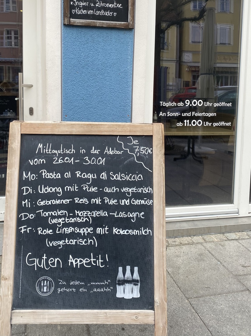 Von Montag bis Freitag servieren wir ein täglich wechselndes Mittagsgericht. Eine kleinere Auswahl an Snacks, wie Chili con Carne, Baguettes und auch Suppen, befinden sich zusätzlich auf der Menükarte.